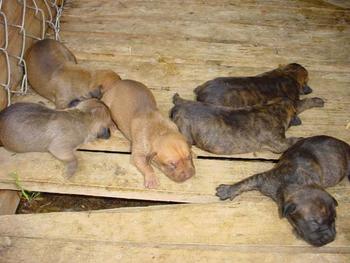 There 3 pups in the front are the only left available. The Black Brindle, Red/Red nose and the Buckskin w/Black Mask. These three are all males.