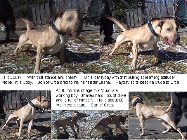 This is a repeat breeding, these pups represent the finest of the Cuda blood. Both dogs are exceptional athletes. Leana is one of the finest females we have ever seen. Pups are 1000.